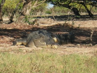 Our first evening in Darwin (last Thursday) was spent at the Nimbil Market, home to hundreds of craft and food stalls, tens of hippies with bad dreadlocks and one fantastic didgereedoo player. In fact he was so good we even bought one of his CDs although, alas, not the Drum 'n' Bass one. After listening to didgeman for 20 mins or so and chomping on a pile of nachos as big as your house we bumped into Jason Gillespie - one of Australia's fast bowlers. He was in town for the test match against Bangladesh starting on Friday. I am pleased to report he looks as tall, ugly and gipsy-esque (Romanic?) in real life as he does on the telly. We retired early (bit like Bangladesh - an innings and 132 runs defeat - OUCH!) due to our early start. We were so bleary eyed that Jen took it upon herself to fall down the stairs, bruising and grazing her knees. 'These things always come in threes don't they...?' I thought...only to be proved spectacularly right in the course of the trip.